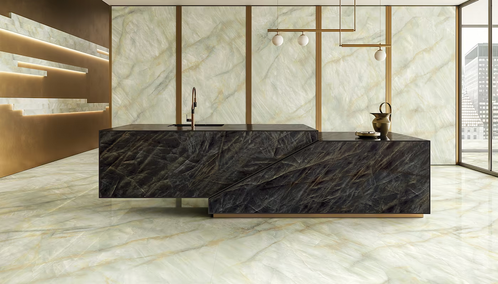 Dużą przewagą tej kolekcji jest przemyślana paleta formatów, która pozwala prowadzić jeden materiał przez różne strefy domu. Najbardziej spektakularny efekt daje 120×278 cm w grubości 6,5 mm – to format stworzony do dużych, nowoczesnych płaszczyzn ściennych, gdzie minimalna liczba podziałów wizualnie podnosi standard wnętrza. Kolekcję uzupełniają formaty 120×120 cm oraz 60×120 cm w grubości 9 mm, dzięki czemu łatwo zachować ten sam wygląd także w strefach bardziej użytkowych, na posadzkach i ścianach. Wszystkie kluczowe warianty są rektyfikowane, co umożliwia układanie z wąską fugą i uzyskanie efektu jednolitej, eleganckiej tafli.