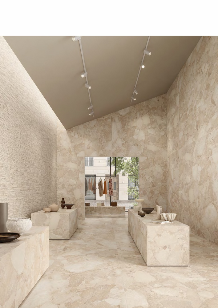 Kolekcja Ergon Matera Stone obejmuje cztery dopracowane odcienie: Beige, Dark Grey, Greige oraz White, które pozwalają budować spójne aranżacje w różnych stylach. Charakter kolekcji tworzą trzy warianty struktury: Sassi, Neutra i Ritmo. Sassi wyróżnia się bardziej naturalnym, kamienistym rysunkiem i subtelną fakturą, która podkreśla autentyczność inspiracji wapiennym kamieniem. Neutra to spokojniejsza, bardziej jednolita interpretacja kamienia, idealna do nowoczesnych wnętrz, gdzie liczy się minimalizm, równy rytm powierzchni i elegancka baza na większe metraże. Ritmo wprowadza wyraźniejszy rytm i pracę światłocienia, dlatego świetnie sprawdza się jako akcent, który wzbogaca wnętrze o głębię i bardziej architektoniczny charakter. Dodatkowo kolekcja występuje w dwóch wykończeniach powierzchni: Naturale, które daje naturalny, matowy odbiór kamienia i jest bardzo uniwersalne na ściany oraz podłogi, oraz Silktech, zapewniającym bardziej miękkie, eleganckie wykończenie z praktyczniejszymi właściwościami użytkowymi, cenione zwłaszcza w strefach, gdzie liczy się bezpieczeństwo i łatwe utrzymanie czystości.