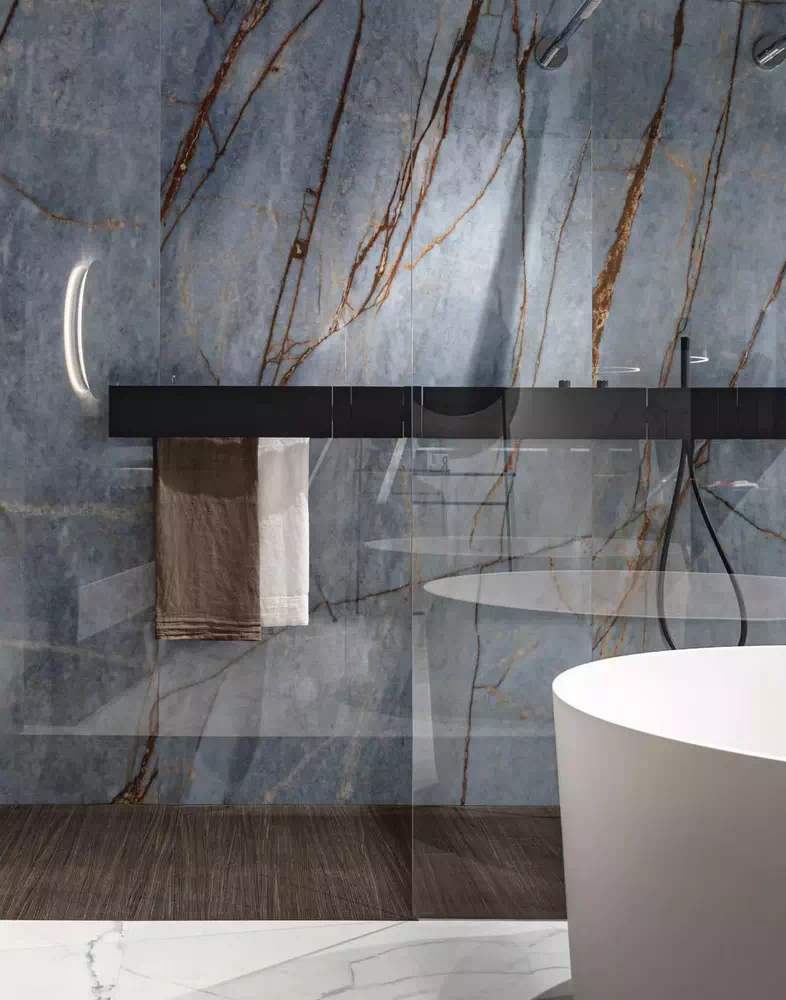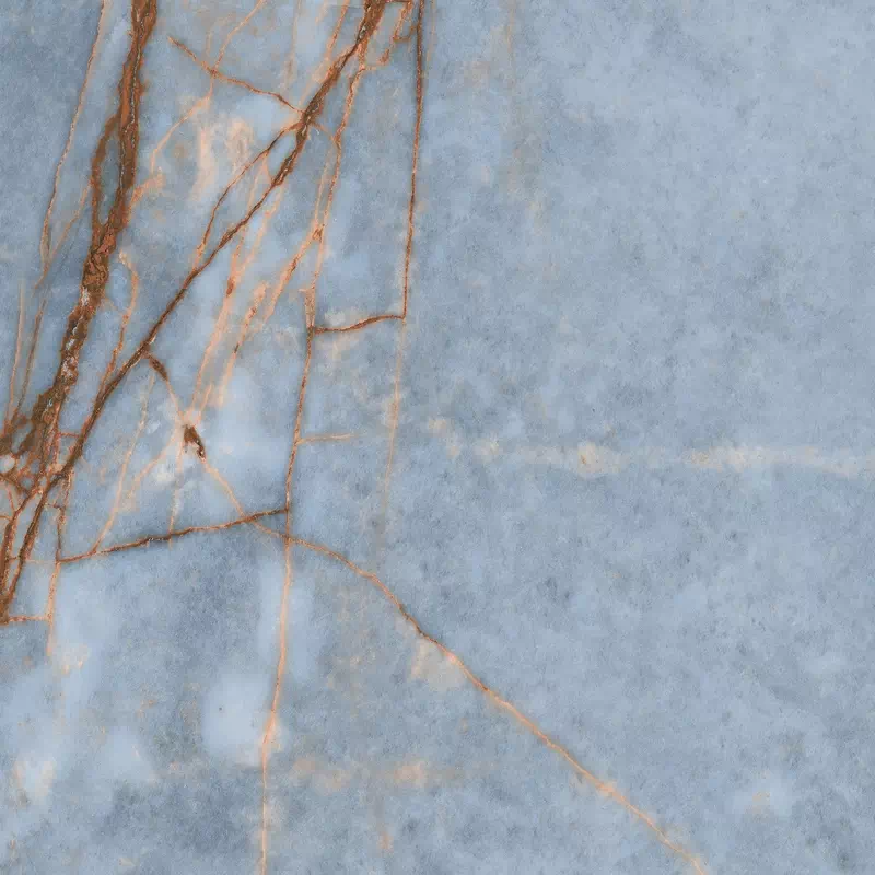 Heritage Azure wyróżnia się bladym, wyrafinowanym niebieskim tłem, na którym wyróżnia się głęboka rdzawa żyła, dzięki czemu idealnie nadaje się do łączenia z ciepłymi kolorami i materiałami.
