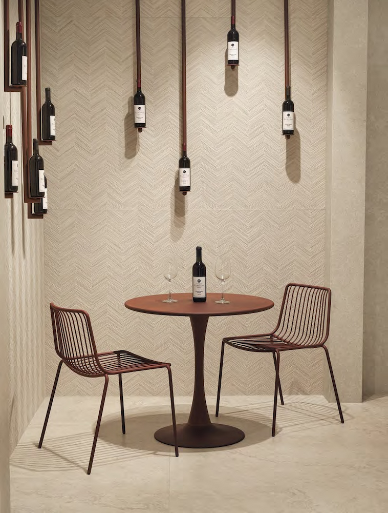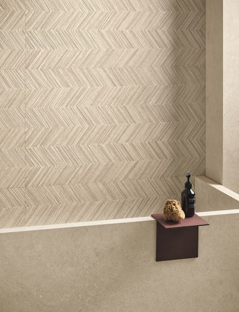 W kolekcji Provenza Unique Bourg bardzo ważną rolę odgrywa nie tylko kolor i format, ale również rodzaj powierzchni. Wariant naturale to matowa płyta, która podkreśla spokojny, naturalny wygląd kamienia i dobrze sprawdza się w aranżacjach opartych na prostocie, świetle i materiałowej równowadze. Lappato antique ma z kolei charakter bardziej dopracowany i dekoracyjny, ale bez efektu mocnego połysku. To satynowa płyta z delikatną strukturą, która bardzo ładnie wydobywa rysunek powierzchni i nadaje jej większej naturalności. Dzięki temu kamień wygląda głębiej, bardziej autentycznie i bardziej szlachetnie, a samo wnętrze zyskuje miękki, elegancki efekt. W kolekcji występuje również Pointes, czyli dekor w kształcie jodełki, który pozwala wprowadzić na ścianę wyraźniejszy rytm i bardziej dekoracyjny akcent, ale nadal w spójnym języku całej serii.