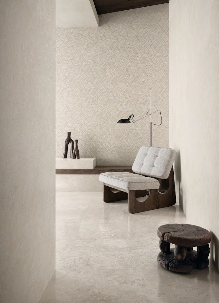 W kolekcji Provenza Unique Bourg bardzo ważną rolę odgrywa nie tylko kolor i format, ale również rodzaj powierzchni. Wariant naturale to matowa płyta, która podkreśla spokojny, naturalny wygląd kamienia i dobrze sprawdza się w aranżacjach opartych na prostocie, świetle i materiałowej równowadze. Lappato antique ma z kolei charakter bardziej dopracowany i dekoracyjny, ale bez efektu mocnego połysku. To satynowa płyta z delikatną strukturą, która bardzo ładnie wydobywa rysunek powierzchni i nadaje jej większej naturalności. Dzięki temu kamień wygląda głębiej, bardziej autentycznie i bardziej szlachetnie, a samo wnętrze zyskuje miękki, elegancki efekt. W kolekcji występuje również Pointes, czyli dekor w kształcie jodełki, który pozwala wprowadzić na ścianę wyraźniejszy rytm i bardziej dekoracyjny akcent, ale nadal w spójnym języku całej serii.