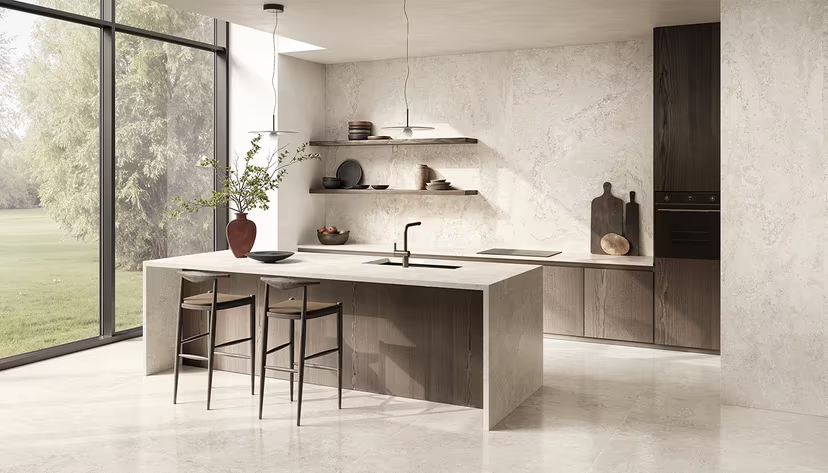 Kolekcja została zaprojektowana tak, aby dawać większą swobodę w budowaniu charakteru wnętrza. Variée ma bardziej dynamiczny rysunek i wyraźniej pokazuje ruch kamienia, dlatego dobrze sprawdza się tam, gdzie powierzchnia ma mocniej budować charakter aranżacji. Minimal jest spokojniejsza, bardziej neutralna i subtelna, dzięki czemu świetnie nadaje się do większych płaszczyzn oraz wnętrz, w których liczy się wizualny porządek i eleganckie tło dla mebli, światła oraz dodatków. Pointes to dekor w formie jodełki, który wprowadza bardziej rytmiczny, dekoracyjny detal i może stać się mocnym, ale nadal spójnym akcentem całej kompozycji.